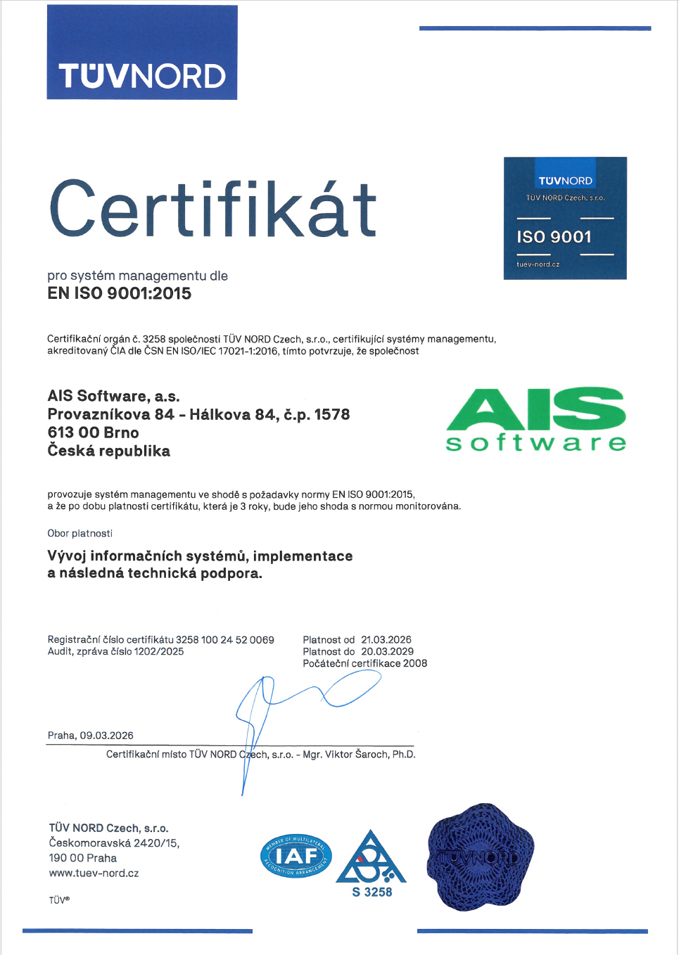 V březnu roku 2008 získala společnost AIS Software, a.s. certifikát pro systém managementu jakosti EN ISO 9001:2008 pro obor platnosti: